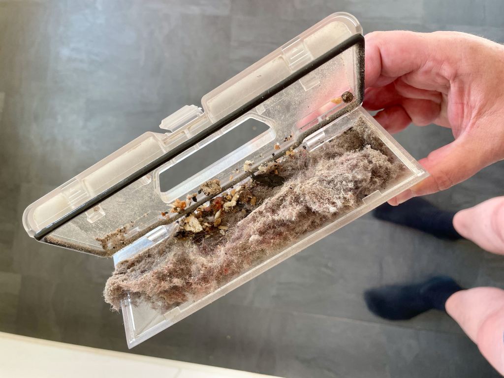 Dammsamlaren är inte så stor och den fylldes ganska snabbt med damm. Räkna med att behöva tömma den efter i princip varje större dammsugarrunda. Testade även att moppa golvet i köket. Då ska man använda en annan dammsamlare som har en liten tank för vatten vid sidan plus att man får sätta på tillbehöret med en mikrofiberduk som fuktas av dammsugaren. Det kändes lite skakigt att komma med vatten till en elektrisk pryl men det fungerade om man är lite försiktig. Således har dammsugaren tre sätt att städa, bara dammsugning, bara moppning och ett läge med både moppning och dammsugning. Det tog lite längre tid att moppa än att dammsuga. Som synes på filmen nedan så jobbar den ganska noggrant när den moppar.