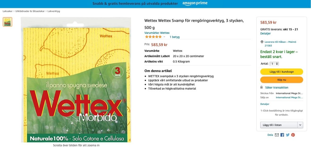Sökte efter Wettexdukar och hittade den dyraste förpackning jag sett. Nästan 600 kronor för en förpackning med tre dukar. Ett rövarpris om något. Just denna vara säljs inte av Amazon själv utan av en försäljare som säljer via dem. Gissar att det är fri prissättning men man kan undra vilken koll de har på sina externa försäljare? Har sett fler varor där priset är helt tokigt högt och det känns nästan som att de försöker lura kunderna. Wettexdukarna på bilden ovan har lyckats få ett femstjärnigt betyg av en stackare som om han betalt det priset blivit rejält blåst.