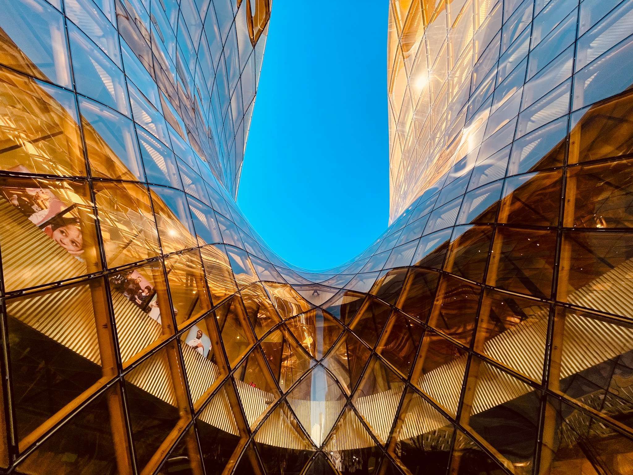 Den snygga fasaden på Emporia i Malmö. Bärnstensfärgad vid denna entré och blå på entrén på andra sidan av köpcentrat.