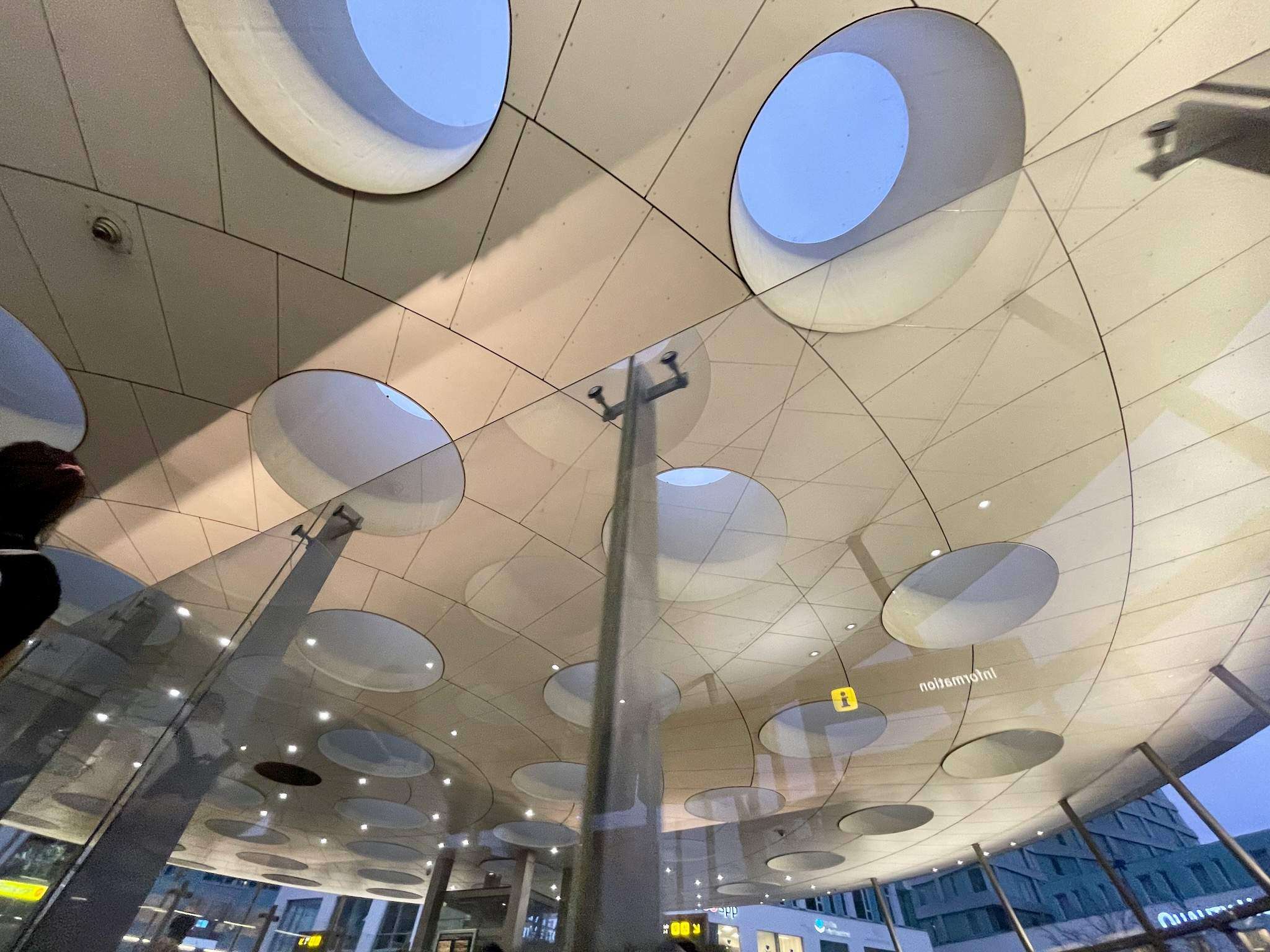 Det känns som man är under en gigantisk golfboll när man tittar upp på Hyllie station. Som pendlare blir man annars lite immun mot vardagens resande men igår slog det mig att taket liknar en golfboll. Det är annars en fin station men som skulle må bra av att ha lite mer faciliteter.