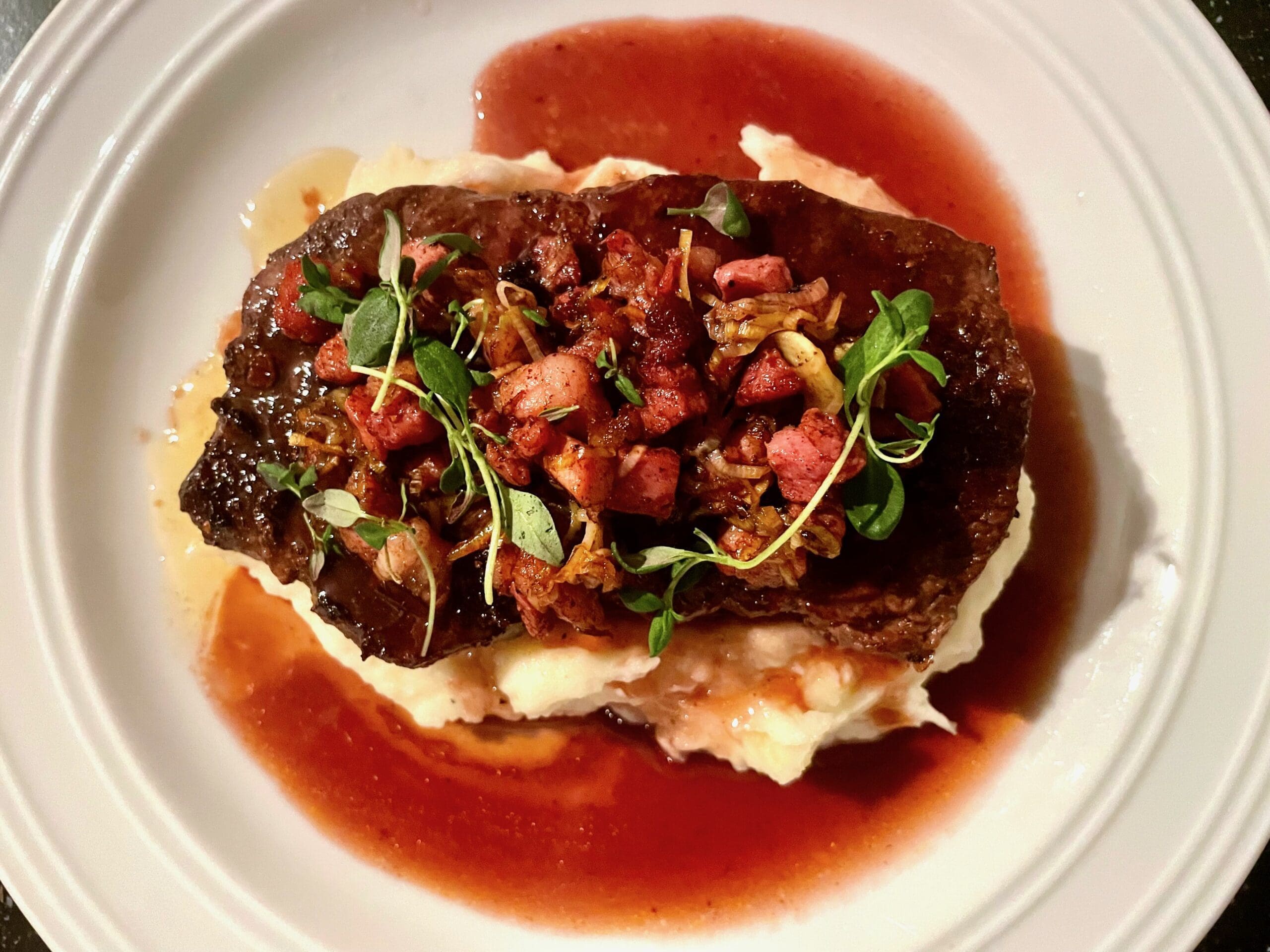 Sedan är det bara att lägga upp mosen på tallrik och köttet toppat med sås och fläsk/baconröran. Dekorera med några kvistar timjan. Rätten tar mindre än en timme att göra och passar lika bra en vanlig.vardag som till festen på helgen. Som sagt, en svensk klassiker.